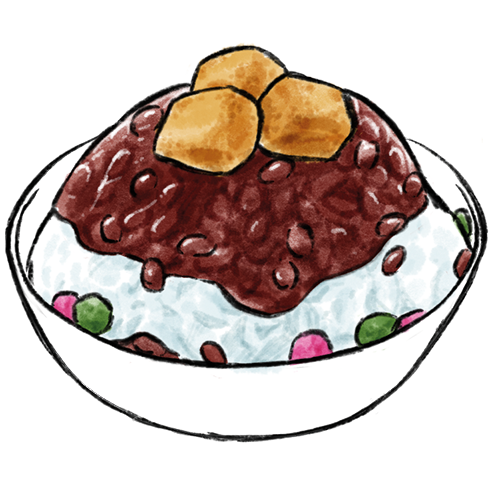 Allergene: b,c Koranisches Milch-Eis mit verschiedenen Zutaten zur Auwahl: 1. Azukibohnen mit Obst, 2. Match, 3. Erdbeere, 4. Mango