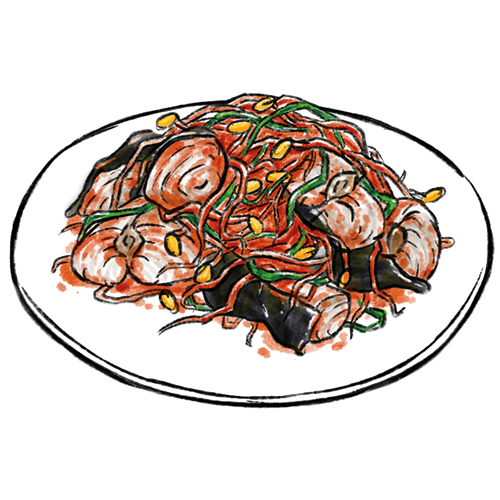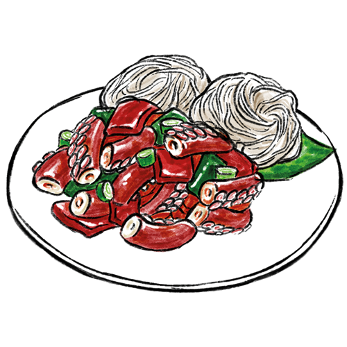 Allergene: a,m Gebratene Okotpus mit Weizennudeln und verschiedene Gemüsesorten in einer scharfen Sauce.