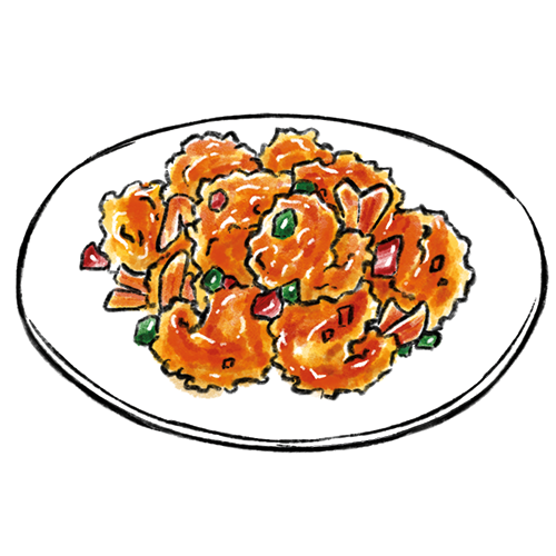 Allergene: a,b,f Frittierte Garnelen mit verschiedene Gemüsesorten in einer scharf-sauer Sauce. (scharf)