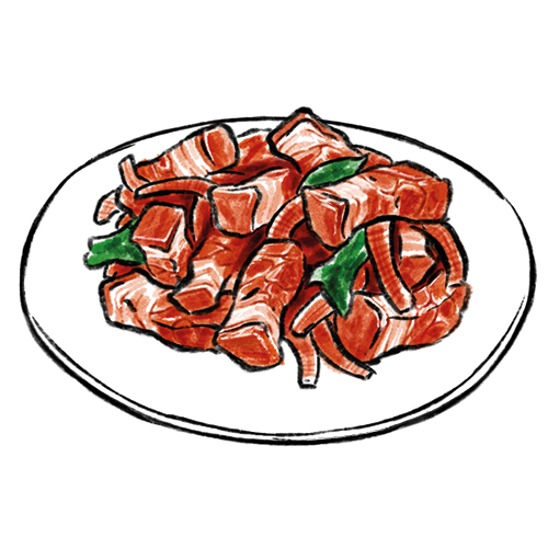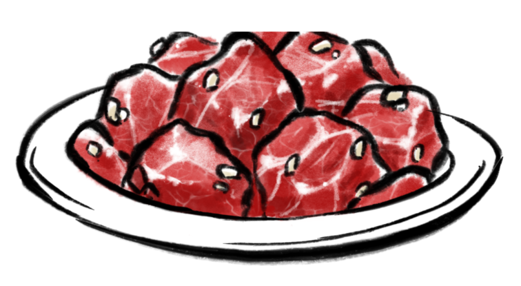 Allergene: d,k 250-300g Mariniertes Rindfleisch mit Knoblauch und Sesamöl. (Ab einer Portion möglich)