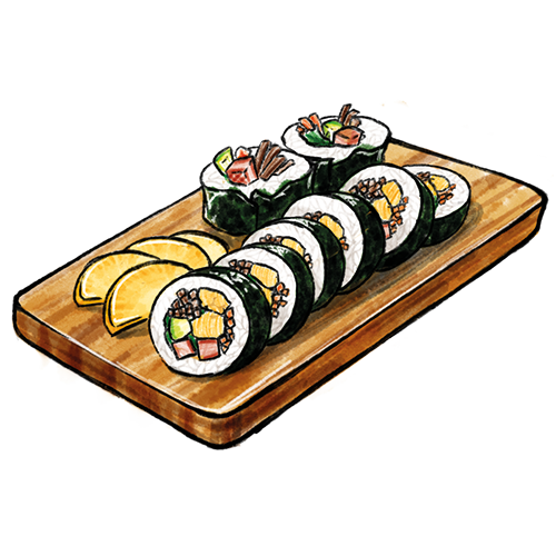 Allergene: a,f Seetangrolle mit eingelegte Gemüsesorten und Reis. Serviert mit süß-sauren Rettichen.