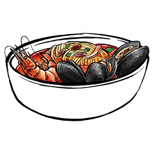 Allergene: d,k Hausgemachte Weizennudeln mit verschiedene Gemüsesorten und Meeresfrüchte in einem Sud.