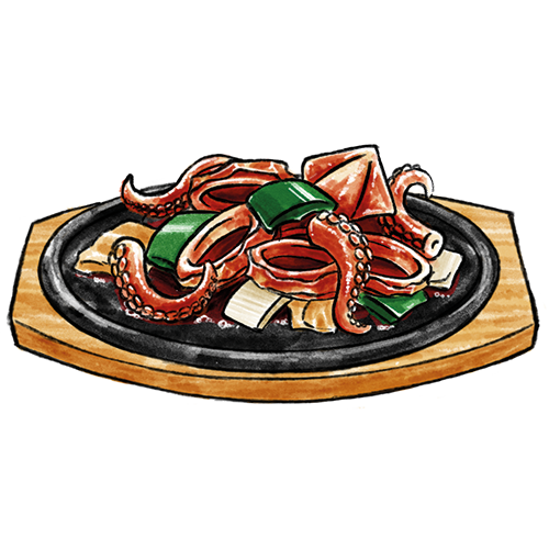 Allergene: a,f,m Gebratener Tintenfisch und Schweinefleisch mit verschiedene Gemüsesorten in einer scharfen Sauce (scharf)