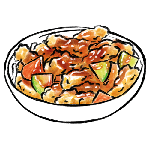 Allergene: a,f Frittiertes Hähnchen ohne Knochen, gebraten in einer süßen-würzigen Sauce.