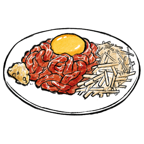 Allergene: c,k Rinder Tatar gewürzt mit Eigelb, Knoblauch, Birne und Gurke.