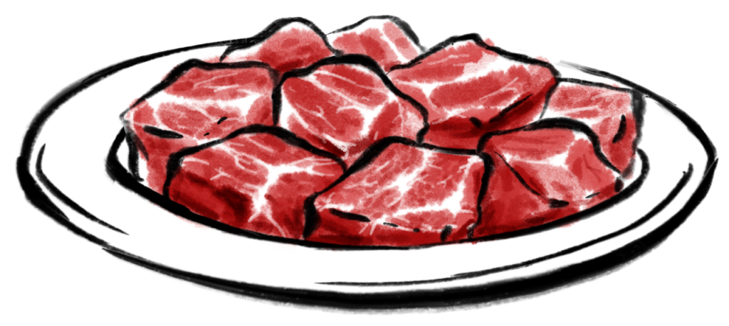 250-300g Premium Rindfleisch in Stückchen geschnitten. (Ab einer Portion möglich)